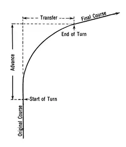 - Use Advance and Transfer to Find Turning Points. The distance the vessel moves along its original course from the time the rudder is put over until the new course is reached is called advance. The distance the vessel moves perpendicular to the original course during the turn is called transfer.The track determined above does not account for these. See Figure 802a. Use the advance and transfer characteristics of the vessel to determine when the vessel must put its rudder over to gain the next course. From that point, fair in a curve between the original course and the new course. Mark the point on the original course where the vessel must put its rudder over as the turning point. See Figure 802b.