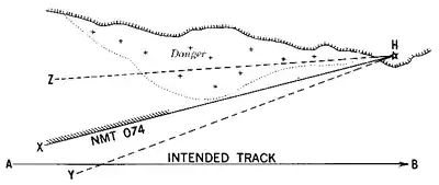 - Plot Danger Bearings: Danger bearings warn a navigator he may be approaching a navigational hazard too closely. See Figure 802d. Vector AB indicates a vessel’s intended track. This track passes close to the indicated shoal. Draw a line from the NAVAID H tangent to the shoal. The bearing of that tangent line measured from the ship’s track is 074.0°T. In other words, as long as NAVAID H bears less than 074°T as the vessel proceeds down its track, the vessel will not ground on the shoal. Hatch the side of the bearing line on the side of the hazard and label the danger bearing NMT (no more than) 074.0°T. For an added margin of safety, the line does not have to be drawn exactly tangent to the shoal. Perhaps, in this case, the navigator might want to set an error margin and draw the danger bearing at 065°T from NAVAID H. Lay down a danger bearing from any appropriate NAVAID in the vicinity of any hazard to navigation. Ensure the track does not cross any danger bearing.