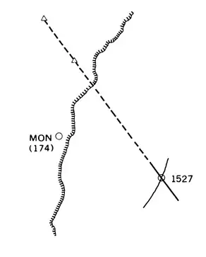 Figure 802d. A danger bearing, hatched on the dangerous side, labeled with the appropriate bearing.