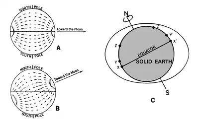 With the Moon in positions between quadrature and new or full, the effect of the Sun is to cause the tidal bulge to either lag or precede the Moon (Figure 908c). These effects are called priming and lagging the tides.
