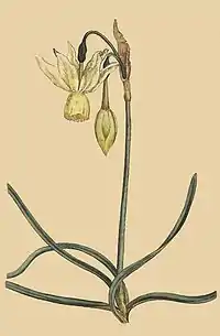 The present species of Narcissus is considered by the Nursery-men near London as the triandrus of Linnæus, which it no doubt is, though it does not accord in every particular with his description: his triandrus is white, ours is pale yellow, but colour is not in the least to be depended on, for it is found to vary in this as in all the other species; his triandrus he describes as having in general only three stamina, whence the name he has given it; ours, so far as we have observed, has constantly six, three of which reach no further than the mouth of the tube, a circumstance so unusual, that Linnæus might overlook it without any great impeachment of his discernment; he says, indeed, that it has sometimes six: perhaps, the three lowermost ones may, in some instances, be elongated so as to equal the others; if he had observed the great inequality of their length, he would certainly have mentioned it.