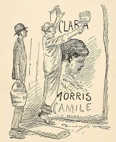 I was in Portland some time later—was there for quite a while, watching the sights of a growing town. One day a fellow with overalls and a bucket of paste asked me if I wanted to work for a ticket. I said, “Yes,” quick. He said, “All right, carry this bucket while I bill the town for Clara Morris and I will give you two tickets for the show.” I asked him what it was and he said “Camille.” It would be two weeks before the show got there, so I took the tickets after a hard, sticky day’s work and went back to Silverton. I exhibited the tickets in the post-office showcase. They were the first Portland theatre tickets ever seen there. I asked a few people what “Camille” was like, but nobody seemed to know. Finally one of my sisters that was going on the other ticket said she knew it was a comic opera and we want to see Clara Morris in “Camille” without a handkerchief and as a result we both had bad colds into the next month. Country people never use handkerchiefs for but one purpose and that is a cold, and as we were free from colds at that time we didn’t think of taking any. Oh, I