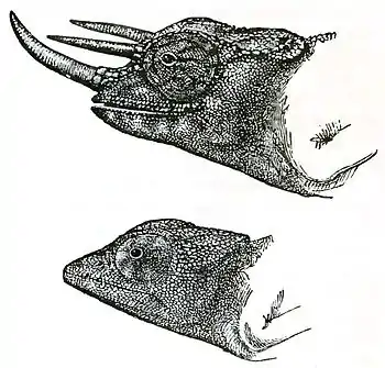 Fig 36. Chamæleon Owenii. Upper figure, male lower figure, female. the general integuments of the body, so that they are identical in structure with those of a bull, goat, or other sheath-horned ruminant. Although the three horns differ so much in appearance from the two great prolongations of the skull in C. bifurcus, we can hardly doubt that they serve the same general purpose in the economy of these two animals. The first conjecture, which will occur to every one, is that they are used by the males for fighting together; and as these animals are very quarrelsome,[69] this is probably a correct view. Mr. T. W. Wood also informs me that he once watched two individuals of C. pumilus, fighting violently on the branch of a tree; they flung their heads about and tried to bite each other; they then rested for a time, and afterwards continued their battle.