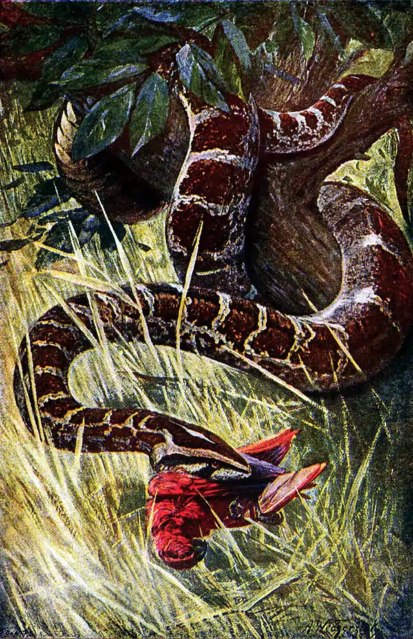 The biggest pythons arc those of southern Asia, the first place belonging to the netted python (Python reticulatur) of Indo-China and the Malay Archipelago, which sometimes exceeds 30 feet in length and is perhaps the largest kind of serpent known. It is light yellowish brown with squarish black markings and its skin glitters in the sunlight with splendid prismatic hues. It abounds in hot, low-lying regions and has a savage disposition. Its rate of growth is slow and it probably lives to a great age. The adigar (P. molurus) of all India, Ceylon and Malaya, reaches nearly the same length and is of heavier build; it varies from yellowish to dark brown in ground-color, with elongate, irregular dark blotches. The three African species known as “rock-snakes,” are smaller, none exceeding 18 feet long. One of them, the royal python (P. regia), dark-brown, with a row of light spots along the back, is the species most often seen in traveling menageries. Another (P. sebæ) is called “fetch-snake,” on account of the superstitious regard paid it by the negroes of the West Coast. It is marked with many dark zig-zag cross-bars and a dark line along the spine. Australia possesses several pythons, which are smaller and more active than the tropical species. Two, the carpet-python and the diamond snake, are common and well known; they are pests of the poultry-yard, but useful as destroyers of rats and rabbits.