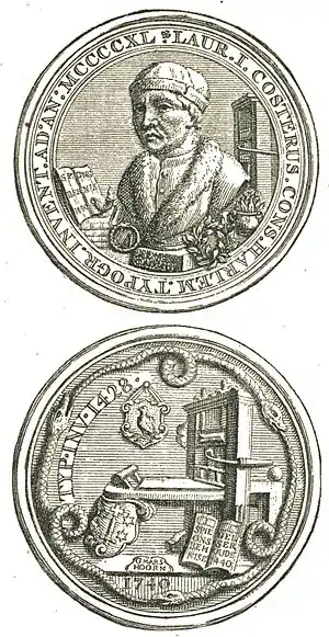 - ↑ Laurecrans voor Laurens Coster von Haarlem, eerste Vinder von de Boeckdruckery, etc. Haarlem, 1628. Reprinted in Dutch, with description in Latin, in Wolf's Monumenta Typographica, vol. i, pp. 209-451. The poetry of Scriverius is as whimsical as his prose. Here is his charge of theft against John Gutenberg: