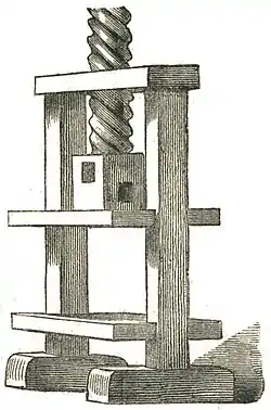 The testimony shows that Gutenberg had a knowledge of three distinct arts. The one earliest practised, from which Dritzehen derived a good profit, was the polishing of stones or gems. The second, was that of making mirrors. Gutenberg was not the inventor of this art, but he was one of the first to practise it.[12] The early German mirrors were small, but they had broad frames, and were richly gilt and adorned with carved or moulded work in high relief. Ottley thinks that the press was used for pressing mouldings for the frames of mirrors, and that the lead was used for the metallic face.