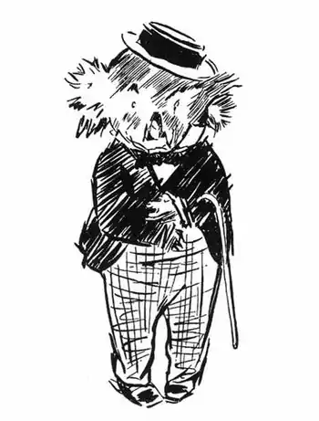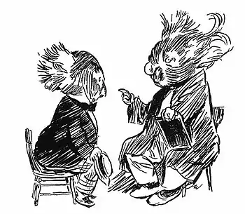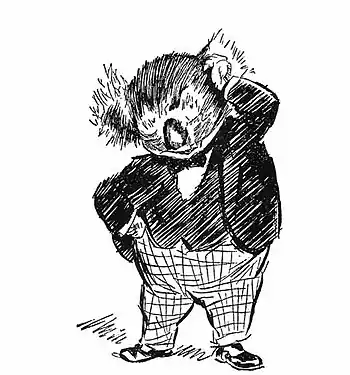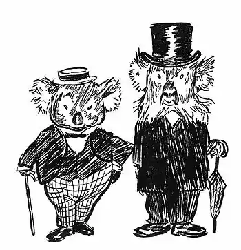 This is a frontways view of Bunyip Bluegum and his Uncle Wattleberry. At a glance you can see what a fine, round, splendid fellow Bunyip Bluegum is, without me telling you. At a second glance you can see that the Uncle is more square than round, and that his face has whiskers on it.