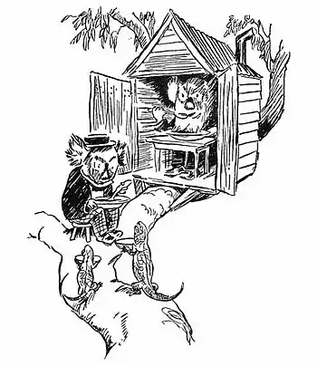 "The solution is perfectly simple," said Bunyip. "We have merely to stop wandering along the road, and the story will stop wandering through the book. This, too, will baffle the puddin' thieves, for while we wander along the road, our Puddin' is exposed to the covetous glances of every passing puddin'-snatcher. Let us, then, remove to some safe, secluded spot and settle down to a life of gaiety, dance and song, where no puddin'-thief will dare to show a sacrilegious head. Let us, in fact, build a house in a tree. For, mark the advantages of such a habitation—