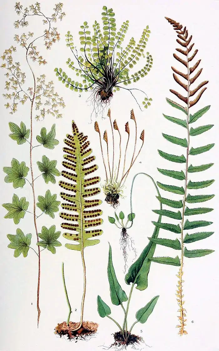 The sexless, leafy plant consists in the main of a subterranean dorsiventral stem, which gives out secondary roots from beneath and sends up characteristic aerial leaves which have long been called ‘fronds.’ The leaves are recognized not merely by their ordinary habit of branching, but better by their venation, which is forking or dichotomous (q.v.), and by their vernation, which is coiled or circinate. The spore-vessels (sporangia) are borne for the most part on the under surface of the foliage leaves, usually closely associated with the veins, and organized into groups of definite form known as ‘sori.’ The sorus may be round or elongated, and is usually covered by a delicate flap known as the "indusium" (q.v.), which arises from the epidermis. Occasionally the sori are extended along the under surface of the margins of the leaf, as in the maiden-hair fern and common brake, in which case they are protected by the inrolled margin. While in most cases the leaves doing foliage work also produce sporangia, there are some forms in which the two kinds of work are separated, certain leaves doing only foliage work and others producing spores, the latter being called sporophylls, as in the ostrich-fern (Struthiopteris), the climbing fern (Lygodium), the royal tern (Osmunda), etc. An ordinary fern sporangium (spore-vessel) consists of a slender stalk bearing a spore-case. This case has a delicate wall formed of a single layer of cells, and extending vertically almost around it from the stalk, like a meridian about a globe, is a row of peculiar cells with thick walls, forming the heavy ring called the ‘annulus.’ The annulus is like a bent spring, and when the delicate portion of the case-wall yields the spring straightens violently, the case-wall is torn, and in the rebound the spores are discharged with considerable force.