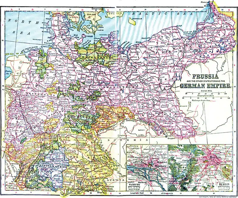 GER′MANY. An empire which takes in the central part of Europe. The main highways between the north and south and the east and west of Europe pass through it. It is in closer touch with most of the leading nations of Europe than any other country; for it is bordered by Russia, Austria-Hungary, Switzerland, France, Belgium, the Netherlands, and Denmark, and is within a day's sail, across the North Sea, of Great Britain. Besides the land boundaries formed by the seven countries above mentioned, it has a a sea frontage of 1200 miles on the North and Baltic seas—one-third of the entire frontier. The country extends east and west through 17 degrees of longitude, or 750 miles; north and south through nearly 9 degrees of latitude, 47° to 56° N., or about 600 miles. Its area is 208,830 square miles. The German Empire embraces the territory of the German Confederation of 1815-66, with the exception of those portions which belonged to Austria (in a great part of which the German language predominates), as well as of Luxemburg and Liechtenstein; but with the addition of the three Prussian provinces of East Prussia, West Prussia, and Posen (not included in the old German Empire), Schleswig, and Alsace-Lorraine. Capital, Berlin.