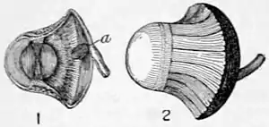 | 1. Section of the eye, showing the interior parts of the pecten at the insertion of the optic nerve (a) by which the vision is regulated under the great possible expansion and contraction of the eye. 2. Sclerotic coat, showing the stave-like pieces, connected by elastic tissue permitting great expansion and contraction. |