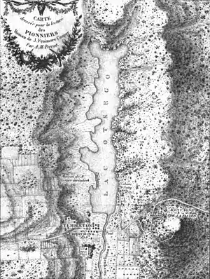 In 1779 an expedition was sent against the hostile Indians, who dwelt about a hundred miles west of Otsego, on the banks of the Cayuga. The whole country was then a wilderness, and it was necessary to transport the baggage of the troops by means of the rivers — a devious but practicable route. One brigade ascended the Mohawk until it reached the point nearest to the sources of the Susquehanna, whence it cut a lane through the forest to the head of the Otsego. The boats and baggage were carried over this "portage," and the troops proceeded to the other extremity of the lake, where they disembarked and encamped. The Susquehanna, a narrow though rapid stream at its source, was much filled with "flood wood," or fallen trees; and the troops adopted a novel expedient to facilitate their passage. The Otsego is about nine miles in length, varying in breadth from half a mile to a mile and a half. The water is of great depth, limpid, and supplied from a thousand springs. At its foot the banks are rather less than thirty feet high the remainder of its margin being in mountains, intervals, and points. The outlet, or the Susquehanna, flows through a gorge in the low banks just mentioned, which may have a width of two hundred feet. This gorge was dammed and the waters of the lake collected: the Susquehanna was converted into a rill.