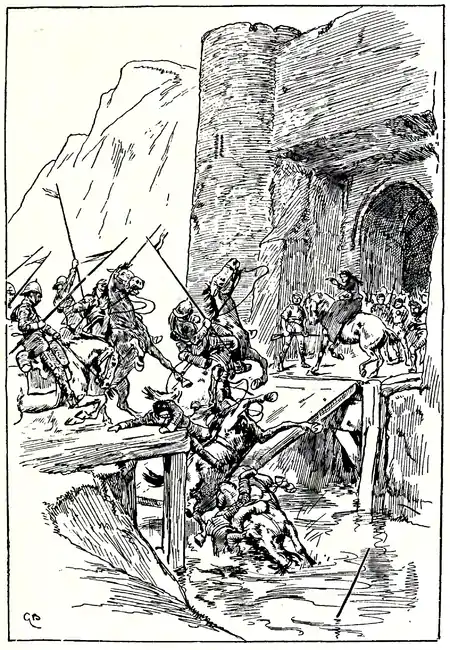 They had blown a horn almost with her order, and at that signal the mob without ran in quickly over the bridge, and came raging into the courtyard, some showing wounds, others telling of men shot and of escapes. But the lancers mounted again and came swiftly over the turf toward the suspended bridge, a young officer leading them with drawn sword.