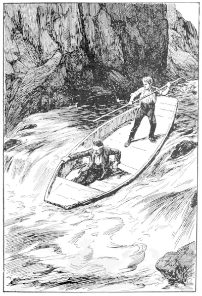 Of this Messenger himself knew nothing. He experienced only the sensation of swift travel through the air; he heard the harsh grating when the tub struck the bank, or bounded off the embossment of a jutting rock; he was conscious that his companion was in the throes of ceaseless work and activity. But to Fisher the picture was very different. Though the heavy wooden tub was abnormally strong, he thought every moment to see her crushed into splinters as the rapids drove her onward at a headlong pace, and the river-bed inclined until the stream itself was like a roaring torrent.