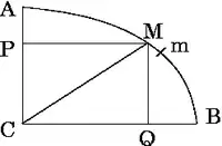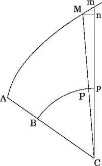11. This same problem may be solved more conveniently by choosing different variables (Figure 28). The method described above does not require that the coordinates be orthogonal to each other, merely that they suffice to define the trajectory uniquely. For this reason, we cannot take as our two variables the radius CM and its component perpendicular to the trajectory, since some trajectories cannot be described using these variables. However, we can take as our coordinates the radius CM and the arc BP of a unit circle centered on C; these two coordinates suffice to determine every point exactly, just as for orthogonal coordinates. This ability to change variables extends the applicability of our Method more broadly than might be imagined otherwise.