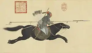 ![]() Zhang Fei's weapon may have looked something like the one in this Qing Dynasty handscroll, but slightly longer Cheng Yuanzhi was furious, so he dispatched Deng Mao, his second in command, to mount an offensive. Zhang Fei raised his 1.8 zhang snake lance,[45] and thrust it straight out, piercing the center of Deng Mao's chest with exact precision,[46] who then doubled over and fell from his horse. Having witnessed Deng Mao's demise, Cheng Yuanzhi whipped his horse into action. Raising his sword above his head with a flourish, he went straight after Zhang Fei. Yunchang swung around his large blade, and rode out on his horse at full gallop. Cheng Yuanzhi was completely taken aback at the sight of this, and was unable to react in time. He was cut in two at the point where Yunchang had raised his blade. People in later generations wrote a poem in praise of the two: |