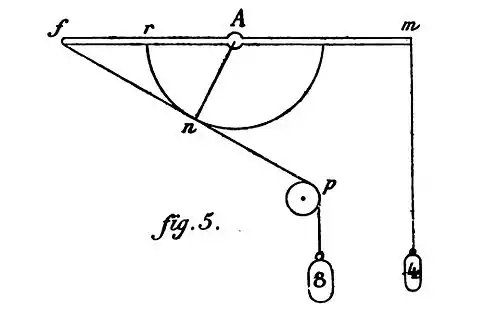 - "The weight q, because of the right angle n, above df, is two thirds as heavy as its natural weight, which was three pounds, which remains with the power of two pounds, and the weight p which, to it also, had three pounds, remains with the power of one pound, because of m rectangle of the line hd, at the point g; therefore we have here two pounds against one pound".