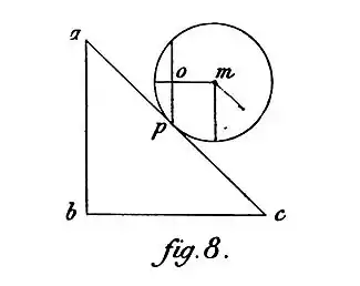- "The spherical and heavy body will take a more rapid movement so much as its contact with the place where it runs is more distant from the perpendicular of its central line. As much as ab (fig. 8) is less long than ac, so much will the ball fall more slowly through the line ac, and so much more slowly as the part o is smaller