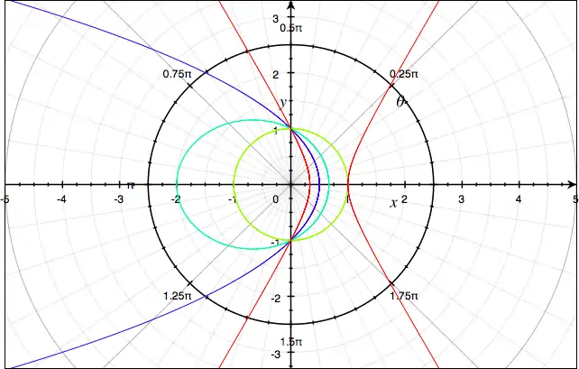 The figure shows the various conic sections as a function of the value , the eccentricity. The blue parabola has , the aqua ellipse has and the green circle has . The red hyperbola has . All of the curves have a focus at the origin and . The semi-latus rectum is the official name for the quantity which sets the size of the curve. In all cases the curve intersects the axis at . In a coordinate free way, the semi-latus rectum is the distance between the curve and the focus in the direction perpendicular to the point of closest approach.