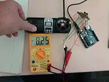 The first step is to see if the Motor and Light wire pairs change voltage without being plugged into the arduino. The RC transmitter has two controls, a wheel and a button with up and down arrows. This probably corresponds to the motor wire pairs. The RC transmitter has a battery and power on/off switch. After powering it on and pushing the wheel fully Counter Clock Wise (CCW), a voltage of 7.4 volts was recorded. Success!