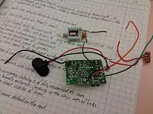 The first step was to replace all the wires (except the antenna) with solid wires that went all the way through the holes of the circuit board and solder them in place. The hacking goal is to figure out what the wires are for. The art work on the top of the circuit board enabled this guess: