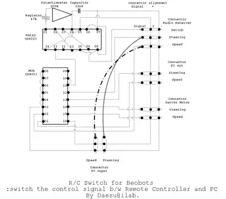 You can build a switch that allows you to override the computer servo inputs from a standard R/C car controller and then run the camera from the remote control manually. This is useful for any robot that is controlled by R/C servos. The design shown below allows such a switch to work. It was originally designed for a mobile robot, to allow for emergency manual override of the robot, but it can be adapted to be used with the Nerd-cam quite easily.