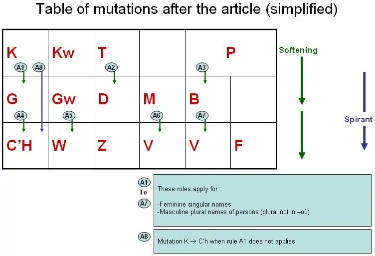 Table of mutationsMutations in Breton obey to regular phonetics laws. They are summarized in the table below (details to be found in the rest of this page) :