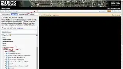 3.This paragraph is about the selection of the right data set(s) for the search. Under Landsat Archive (step 6) the L8 OLI/TIRS (step 7) can be found. L8 OLI/TIRS stands for the Operational Landsat Imager and Thermal Infrared Sensors which are on board of the Landsat 8 Satellite. Why those images are necessary for the NDVI calculation will be explained in paragraph 5 of this chapter. After selecting the L8 OLI/TIRS one can move on to step 8 and select the Additional Criteria tab.