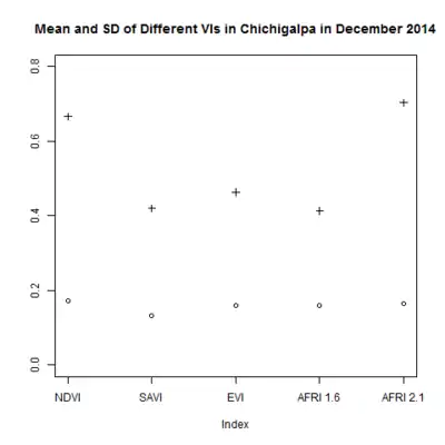 This chapter compares the outcomes of the different vegetation indices NDVI, EVI, SAVI and AFRI, and evaluates advantages as well as disadvantages of each. All five VIs were calculated for the same sector of Chichigalpa in December 2014. The Aerosol Free Vegetation Index 2.1 (AFRI 2.1) resulted in a value of ~0.7, which was the highest of all tested VIs. The lowest value with ~0.41 was computed by AFRI 1.6. The variance of all five VIs was between ~0.017 and ~0.029.