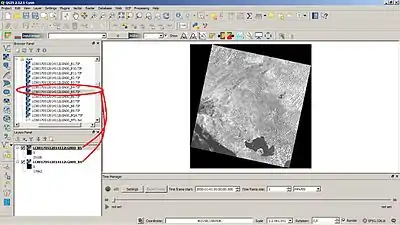 7.The actual NDVI calculation can be done with any geographic information system (GIS), for this example the GNU General Public Licensed software QGIS 2.12.1-Lyon is used. After downloading and opening the program the band layers can be implemented. The images of the layers appear and can now be inspected, as well as further processed.
