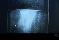 The second image on the left shows the beginning of the superfluid lambda helium state. When liquid helium is cooled down from 4.2 K to the lambda point at 2.2 K, the liquid for a brief moment boils up violently. Suddenly, boiling ceases. This is the transition from the normal phase to the superfluid phase.