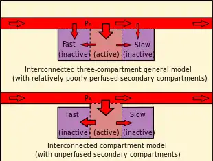 The assumption that perfusion is the limiting mechanism leads to a model comprising a group of tissues with varied rates of perfusion, but supplied by blood of approximately equivalent gas concentration. It is also assumed that there is no gas transfer between tissue compartments by diffusion. This results in a parallel set of independent tissues, each with its own rate of ingassing and outgassing dependent on the rate of blood flowing through the tissue. Gas uptake for each tissue is generally modelled as an exponential function, with a fixed compartment half-time, and gas elimination may also be modelled by an exponential function, with the same or a longer half time, or as a more complex function, as in the exponential-linear elimination model.