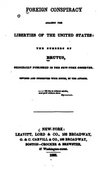Cover of "Foreign Conspiracy Against the Liberties of the United States" by Samuel F.B. Morse, 1835 edition.