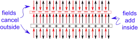 Newton's laws assume that the net force is the sum of all forces, ma=ΣFj (sum over j). Since the electric field, E, is defined through Coulomb's law via F=qE, the simplest possible assumption is that the electric field is the sum of the individual electric fields due to each charge. This is principle is called superposition (or linear superposition) and it holds at least down to the sizes smaller than the atomic nucleus. In fact, we have implicitly assumed superposition by integrating to obtain the electric field due to line and surface charges. As shown in the figure, the electric fields add constructively in the space between the plates. They add destructively (i.e. they subtract) outside the two plates and add to zero electric field. Therefore the electric field between the plates is
