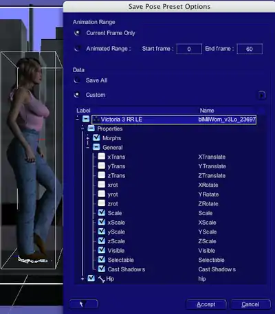 You can use the mirror-image of your character's pose in frame 15 for the pose in frame 45. DAZ Studio allows you to save poses for later re-use. Make sure that your human figure is still selected in your scene. Go to the "Save as..." sub-menu in the DAZ Studio "File" menu. From the "Save as..." sub-menu, select "pose preset". You can save your poses in a folder such as "My poses". To make your pose not include the actual current position of your character, use the custom setting shown in Figure 4.
