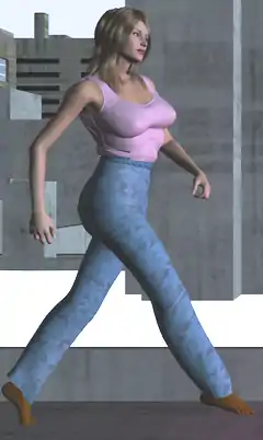 Bending limbs. Try bending the elements of the left leg to make a more realistic appearance for that leg as it moves forward (Figure 3 shows an example). Make use of Chapter 14 in the DAZ Studio manual if you are new to modifying the angles of bones in limbs. Again check that your figure is not sinking into the floor and click the "make key frame" button when you are done adjusting frame 15.