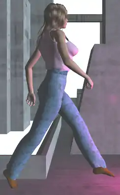 If you are using the "Victoria" character that comes with DAZ Studio, the available preset body poses are for a "fairy" and include poses such as "hovering". For this tutorial, we want to animate walking. The "DAZ Studio 3D Models Pack" that is available for download from several websites includes some additional poses for "Victoria". Figure 1 shows the "V3 stride" preset pose. The sample animation described here (see Figure 6, below) uses this pose at both the start and the end of the animation. If you have not already done so, open a window pane for the DAZ Studio animation timeline. You might want to make use of this animation tutorial and this timeline tutorial to help you become familiar with the controls that are in the timeline pane.