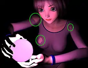 Rather than just have a spike projecting from the "crystal ball", it would be better to have a broader beam of light. A broader projection from the "crystal ball" was produced by using two cooperating D-Formers. Rather than actually create a new "second" D-Former, the existing one was just re-used after creating the morph slider, as described in the previous section of this page. After making the morph slider, the position of the D-Former's force field was changed slightly by moving the force field of the D-Former towards Aiko along the shaft of the spike. This allowed the "beam of light" protruding from the ball to be made broader at the location where it intersected with Aiko's chest (see Figure 4a). Using both the morph slider and the D-former at the same time gives the illusion of a beam of light extending from the sphere to illuminate a patch of the clothing.