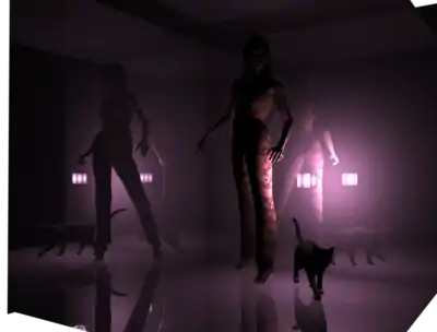 The human figure and the cat have surfaces for which the reflection channel is set to 0%. For this example, the surfaces of the walls and floor were set to have the reflection channel set to 100%. The name "reflection channel" is somewhat misleading because the "diffuse", "specular" and "ambient" channels also allow objects in the scene to be rendered as they would appear because of reflecting light. In terms of physics, there is a distinction between Diffuse reflection and Specular reflection. The distinction is in the organization of the reflected light that leaves the surface. If there is a large amount of specular reflection then the organization and coherence of the original light falling on the object is retained in the reflected light. If there is mostly diffuse reflection then the directions of reflected photons are not consistent with the original directions of the photons that fell on the surface and it is not possible to obtain an image or coherent view (what we typically call a "reflection") of the original light source from the reflected photons. With diffuse reflection, the surface of the object scatters the reflected light in many different directions.
