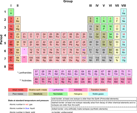 The periodic table of the elements. Click on the image for a full size version which you can freely re-use and modify. Print it and use it for your lessons, integrate it into your pages on Wikiversity, or use it in other learning resources and websites. Use the links below to find more images like this one.