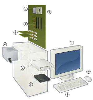 6. Power supply unit 7. Optical disc drive 8. Hard disk drive (HDD) 9. Keyboard. 10. Mouse