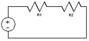 Part 3Voltage DividerThere comes a time when the boss or the project demands that you know what the voltage is between these millions of resistors in series. No need to panic though because it isn't too much harder. Lets take the two-resistor problem first. There is a voltage source with two resistors in series. We know that the overall voltage drop across the two resistors is the same as the voltage the source is supplying in our example world. So the voltage drop across one resistor would be a portion of the overall drop. What proportion would we use to figure out the answer? One resistor over the two added together times the overall voltage drop: