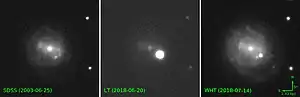 {{fairuse}}The three images on the right record emission events for AT2018cow. The first shows the galaxy Z 137-068. The second down on the right has two markers ending close to the fuzzy bright source AT2018cow. The third down on the right is a sequence of dated images.