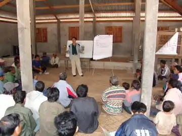 A meeting taking place in Khammouane Province of Laos, March 2006, as part of the Lao Extension Approach. Meeting is being held in village temple, participants are farmers. Who do YOU think the facilitator is in this picture?