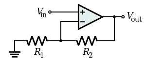 A non-inverting amplifier is a special case of the differential amplifier in which that circuit's inverting input V1 is grounded, and non-inverting input V2 is identified with Vin above, with R1 ≫ R2. Referring to the circuit immediately above,