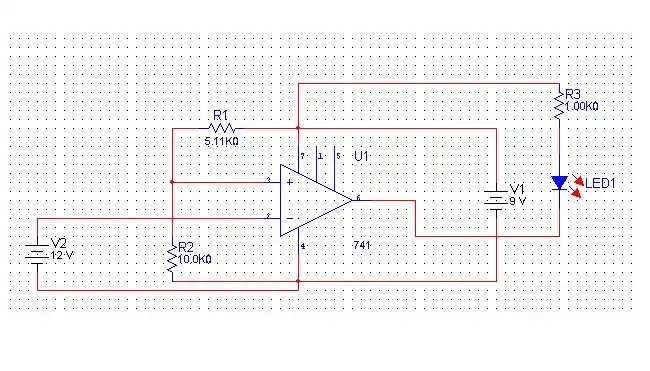 For the further analysis, let us consider the output of the op amp just as a voltage source. Along with a power source circuit, and the LED (Light Emitting Diode) they form a circuit which highs up in case when a current flows through the circuit.