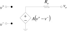 Up to this point we have tacitly treated the output impedance of an op amp as zero. The output impedance of a typical op amp, such as the LM741, is around 75 Ω. A more suitable model of an op amp treats it as a voltage-controlled voltage source with an output resistance . Such a model looks like this: