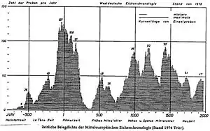 - ↑ Gordon W. Pearson; Florence Qua (1993). "High-Precision 14C Measurement of Irish Oaks to Show the Natural 14C Variations from AD 1840-5000 BC: A Correction". Radiocarbon 35 (1): -24. https://journals.uair.arizona.edu/index.php/radiocarbon/article/viewFile/18069/17799#page=110. Retrieved 2014-10-25.