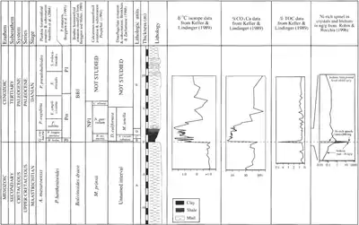 - 1 2 3 4 5 Eustoquio Molina; Laia Alegret; Ignacio Arenillas; José A. Arz; Njoud Gallala; Jan Hardenbol; Katharina von Salis; Etienne Steurbaut et al. (December 2006). "The Global Boundary Stratotype Section and Point for the base of the Danian Stage (Paleocene, Paleogene, "Tertiary", Cenozoic) at El Kef, Tunisia - Original definition and revision". Episodes 29 (4): 263-73. http://www.stratigraphy.org/GSSP/Danian.pdf. Retrieved 2015-01-19.