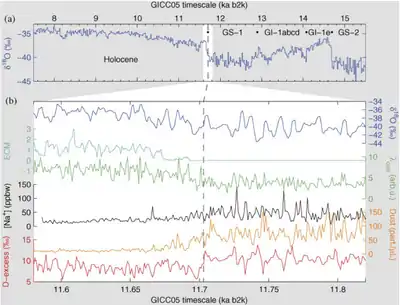 - ↑ S.O. Rasmussen, B.M. Vinther, H.B. Clausen, and K.K. Andersen. Greenland Ice Core Chronology 2005 (GICC05) Early Holocene section. IGBP PAGES/World Data Center for Paleoclimatology Data Contribution Series # 2006-119. NOAA/NCDC Paleoclimatology Program, Boulder CO, USA.